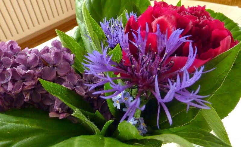 Dunkelrot und Lila und noch ein bisschen (zweierlei) Blau - Kornblume zum einen...