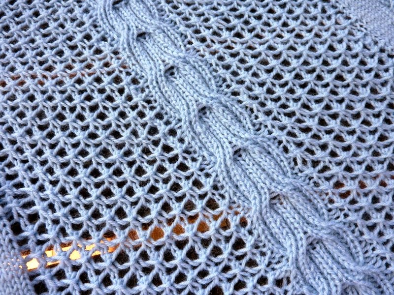 über 67 Maschen Breite ein Pfauenmuster mit je 6 Umschlägen/Abnahmen.